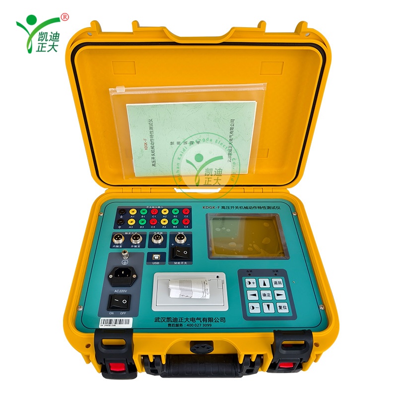 The KDGK-F Circuit Breaker Dynamic Characteristic Tester is a portable, high-precision instrument for analyzing the mechanical performance of high-voltage circuit breakers. It supports 12 break ports to measure closing/opening time, bounce, speed, stroke, current, and energy storage, with a built-in adjustable DC power supply (DC20~256V/15A) for coil action voltage testing. Equipped with a large-screen LCD and Chinese interface, it features strong anti-interference capability (operable in 500kV substations), built-in printer, and data storage, making it ideal for on-site maintenance and factory quality control.