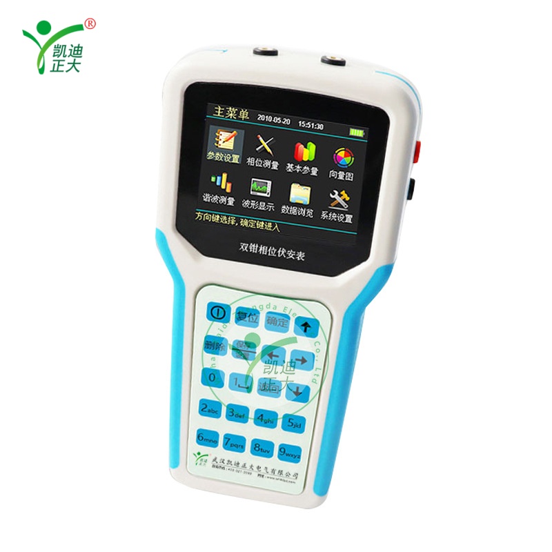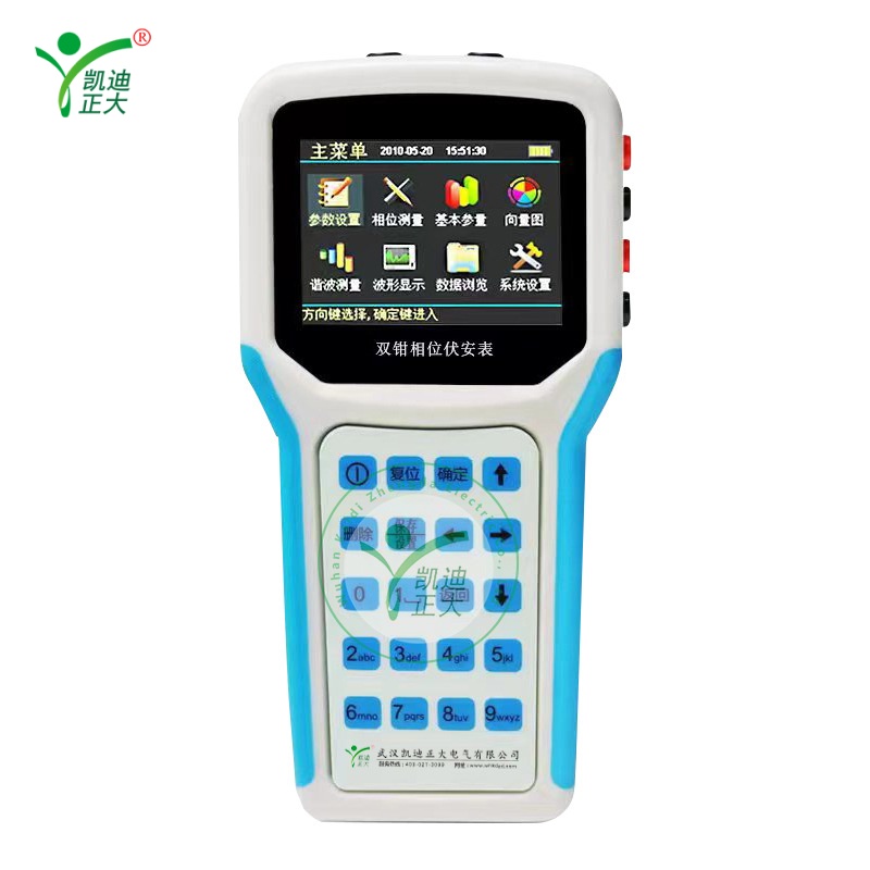 The KDZD2020 is a portable, handheld dual-clamp phase volt-ammeter designed for field power testing. It features a 3.2-inch color TFT display and intuitive GUI, supporting measurement of AC voltage (0~AC600V), current (10A~2000A), phase (-180°~+180°), and power parameters. With built-in data storage (10000 records) and USB export, it enables efficient analysis of transformer wiring, phase sequence, and relay protection systems. Its lightweight design and long-lasting lithium battery make it ideal for field use.