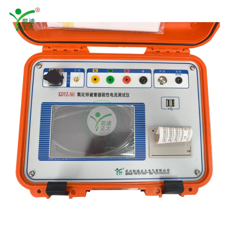 The KDYZ-301 is a professional online tester for zinc oxide (MOA) lightning arresters, designed to measure leakage current, resistive current, and 3rd–7th harmonic currents during operation. It uses isolated voltage/current sensors (input impedance <1Ω) for safe, reliable data acquisition, supporting multiple voltage reference sampling modes (wired, wireless, induction, no-voltage sync). Equipped with an 800×480 touchscreen, thermal printer, and 10000mAh lithium battery, it enables three-phase simultaneous testing, wireless transmission up to 400m, and generates Word reports via upper software, making it ideal for power system maintenance and quality control.