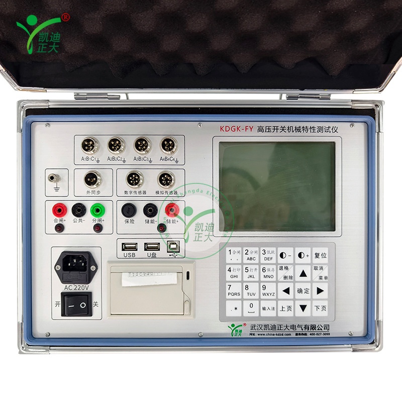 The KDGK-FY High Voltage Switch Mechanical Characteristics Tester is a professional instrument for analyzing the mechanical performance of high-voltage circuit breakers. It adopts an industrial control host with a 600MHz main frequency, supporting high-precision measurement of 12 break ports simultaneously. Equipped with a large-screen LCD and Chinese interface, it can test closing/opening time, bounce, speed, stroke, current, and operating voltage, with built-in printer and U disk data storage. It provides a built-in adjustable DC power supply (DC10~265V/20A) for coil action voltage testing, making it ideal for factory production and on-site maintenance.