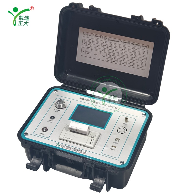 The KDGK-301 Switch Contact Pressure Tester is a professional instrument designed to non-destructively detect the mechanical performance of plum blossom contacts in high-voltage switchgear. It adopts a high-precision aviation industrial strain gauge sensor, ensuring accurate and stable measurement with low temperature drift. Equipped with a 5-inch color touch LCD screen, it provides clear real-time data display and supports unit switching between N and kg. The portable case design, built-in rechargeable lithium battery (supporting ≥8 hours of operation), and integrated printer make it ideal for on-site maintenance and factory quality control. It also features voice prompts, data storage, and USB/U disk data transmission, greatly simplifying the testing process for technicians.