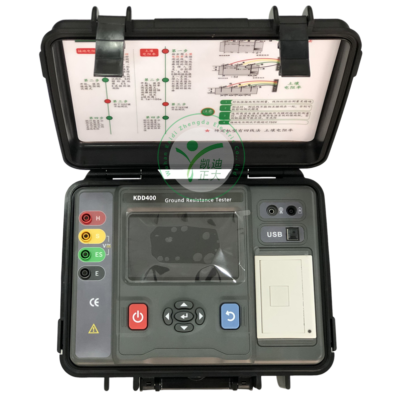 The KDD400 consists of a host, PC upper computer software, mobile APP software, test cable, USB cable, charger, and grounding pin. The functions include two, three, four wire AC grounding resistance, soil resistivity, three/four wire selection method, double clamp resistance, DC resistance, AC voltage, DC voltage, and AC current.