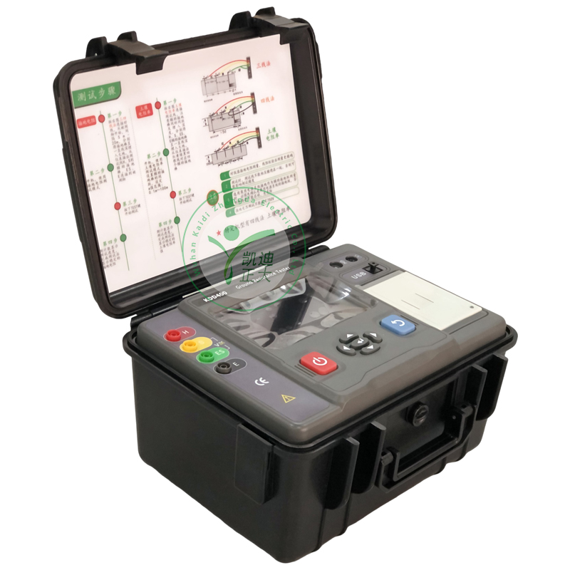 KDD400 is widely used in telecommunications, power, meteorology, computer rooms, oil fields, power distribution lines, iron tower transmission lines, gas stations, factory grounding grids, lightning rods, etc. Instruments have the characteristics of precise, fast, simple, stable and reliable testing. KDD400 is controlled by a microprocessor and can accurately detect grounding resistance, soil resistivity, grounding voltage, DC voltage, DC resistance, and AC current. It uses fast filtering technology to minimize interference. Displaying the resistance value of auxiliary electrodes on the same screen facilitates the determination of measurement errors caused by environmental factors and facilitates more accurate measurement of the true grounding resistance value. Simultaneously store 500 sets of data, connect to a mobile app via Bluetooth, or connect to a computer via USB to achieve wireless or wired remote measurement, read historical data, export report analysis, and other functions. It has functions such as numerical retention and intelligent alarm prompts.